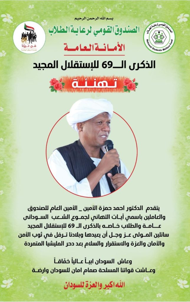 الإمين العام للصندوق القومي لرعاية الطلاب يهنئ الشعب السوداني عامة والطلاب خاصة بالعيد 69 للإستقلال